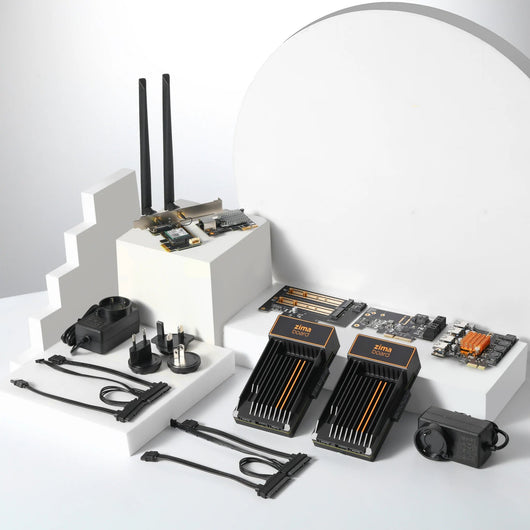 此套件整合了多款主流 PCIe 擴充週邊,涵蓋多重 SATA、乙太網絡、四通道 USB 3.0,或透過 Wi-Fi 6 建構開放式 DIY Wi-Fi 閘道等多元應用情境。套件中隨附的 Y 型 HDD 擴充線,可支援將兩顆 2.5 吋 HDD/SSD 直接安裝於 ZimaBoard 之上。